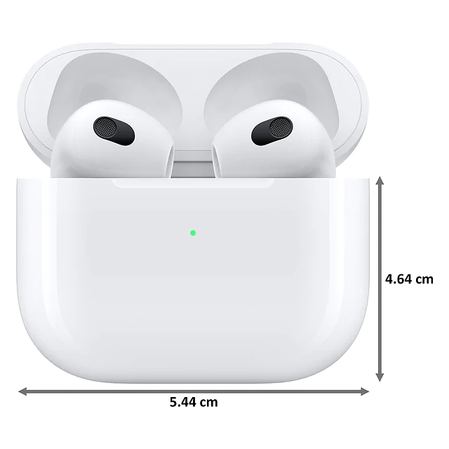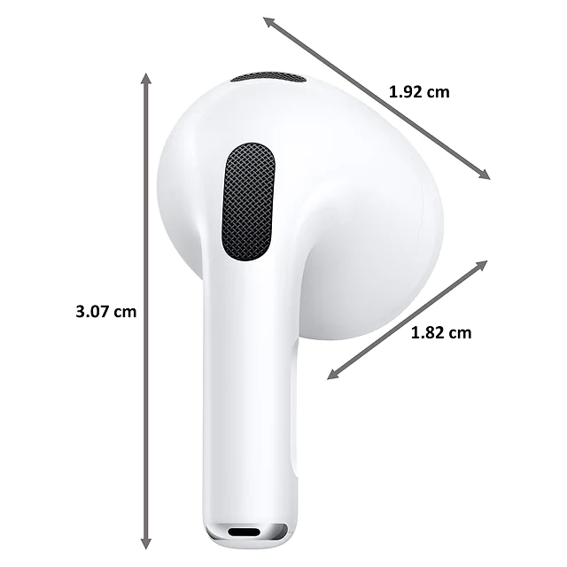 Weight: 4 grams (0.14 ounces)⁷ Charging Case: Height: 53.5 mm (2.11 inches)⁷ Width: 44.3 mm (1.74 inches)⁷